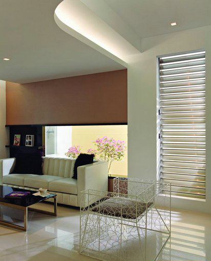 利用大片玻璃窗与百叶窗强调光线透射进来的层次变化,沙发后方的阳台植栽,形成一抹自然景色。